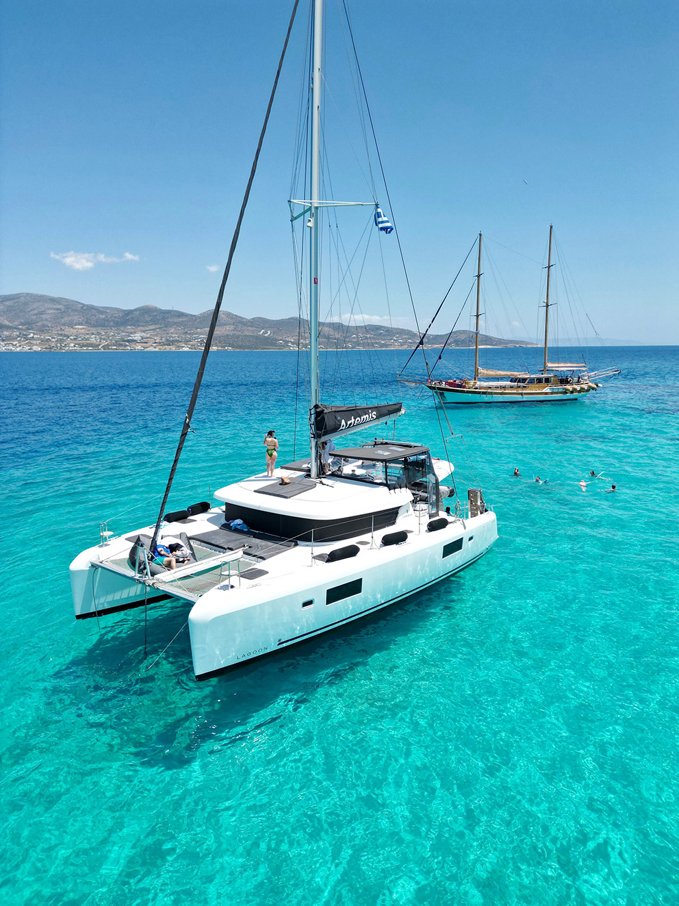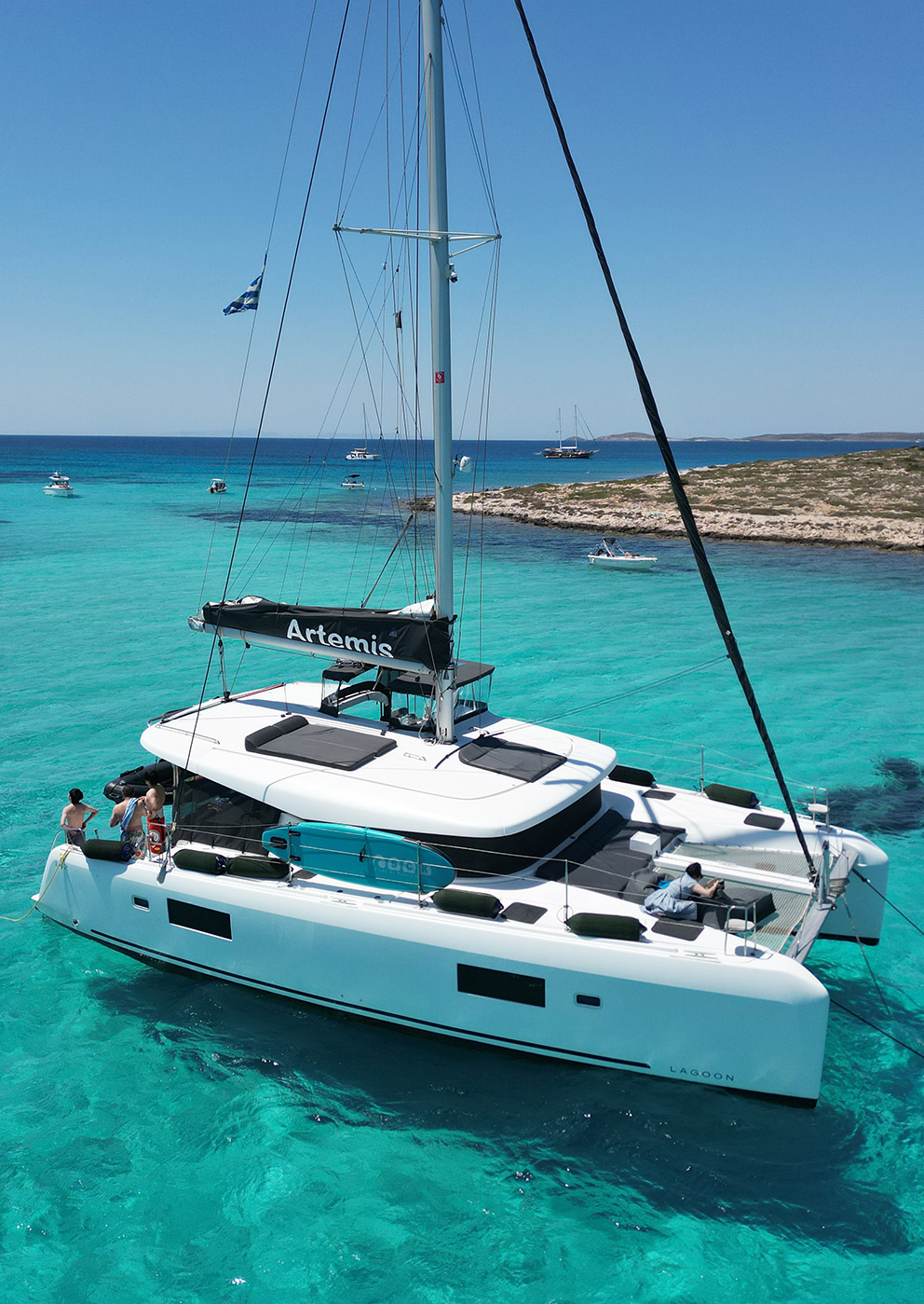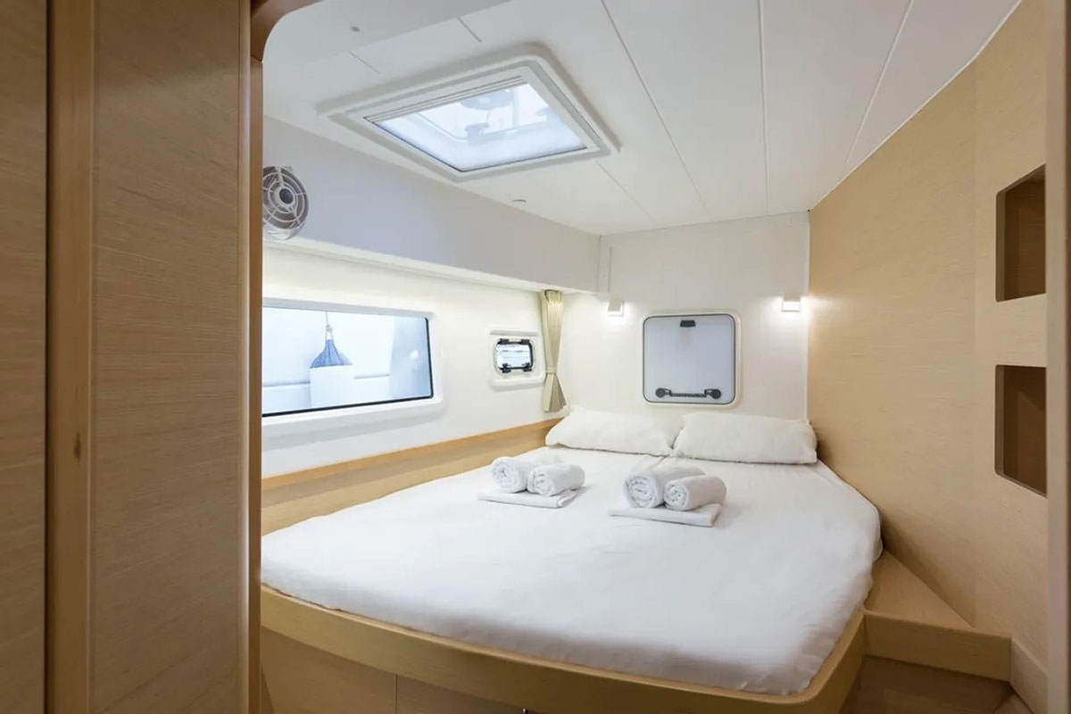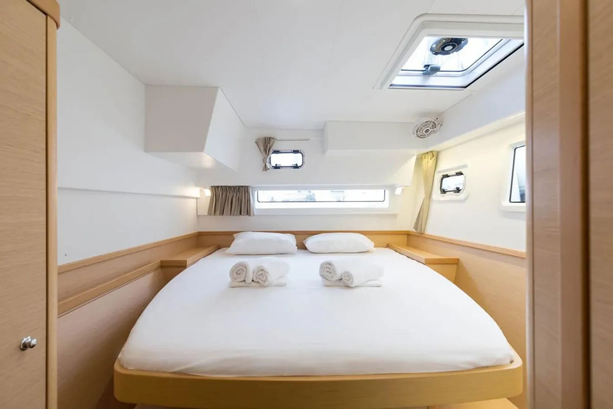 Artemis is our brand new Catamaran Lagoon 42 just added to our fleet. The Lagoon 42 was built for easy sailing with an ideal level of performance that our customers can rely on. The new build of the 42 includes a larger fore triangle making for a greater choice of downwind sails, for easy manoeuvring the boom was shortened, a re-centered weight of the catamaran has greatly reduced pitching, and a broader head of the mainsail takes advantage of less turbulent wind.