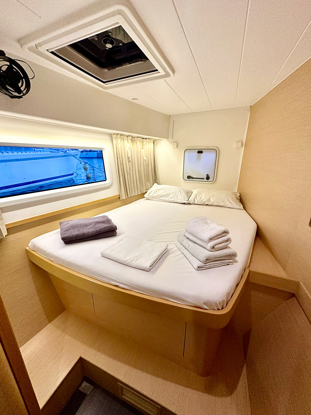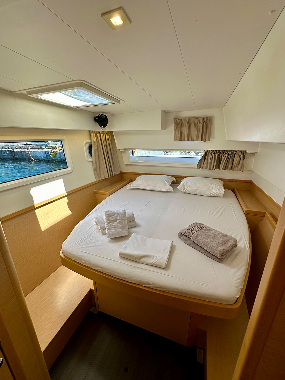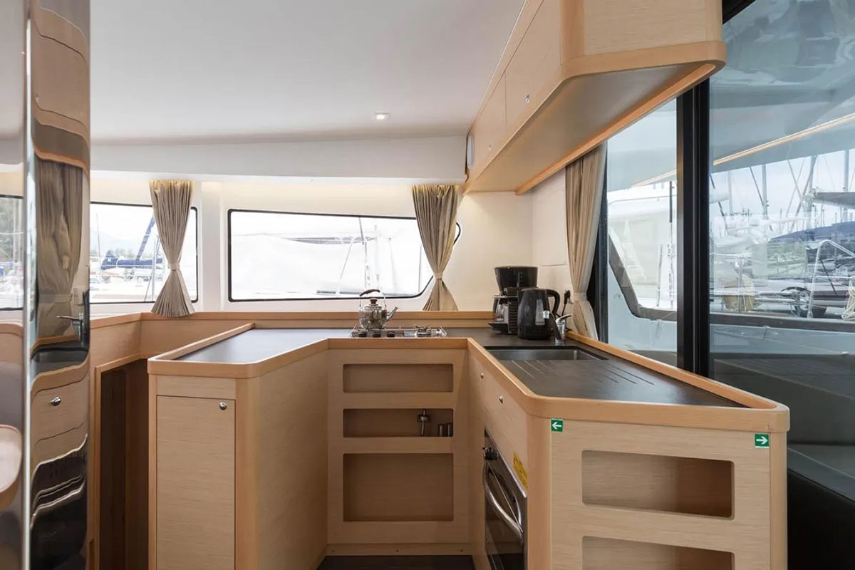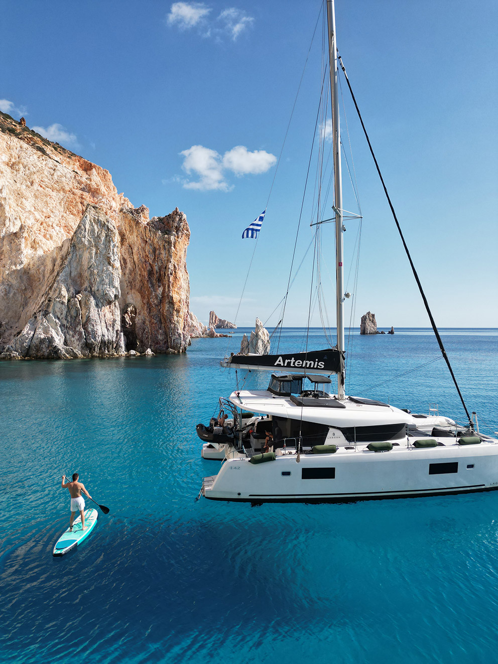 Artemis is our brand new Catamaran Lagoon 42 just added to our fleet. The Lagoon 42 was built for easy sailing with an ideal level of performance that our customers can rely on. The new build of the 42 includes a larger fore triangle making for a greater choice of downwind sails, for easy manoeuvring the boom was shortened, a re-centered weight of the catamaran has greatly reduced pitching, and a broader head of the mainsail takes advantage of less turbulent wind.